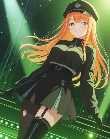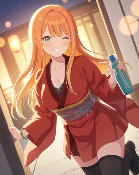 기본: sumika765pro, 긴 머리, 오렌지색 머리, 녹색 눈, 머리 장식, 머리핀