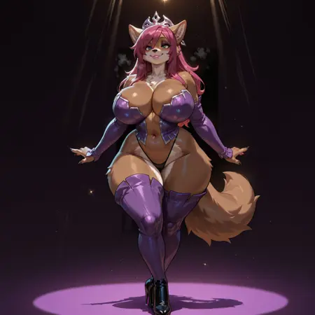 Prompt: olgaoutfit, female, cleavage, revealing clothes, purple elbow gloves, purple thighhighs, purple high stockings, bare shoulders, black thong, headwear, black high heels, black boots, magic staff