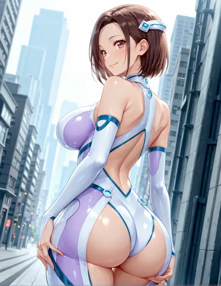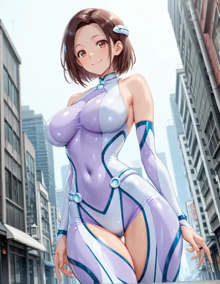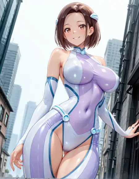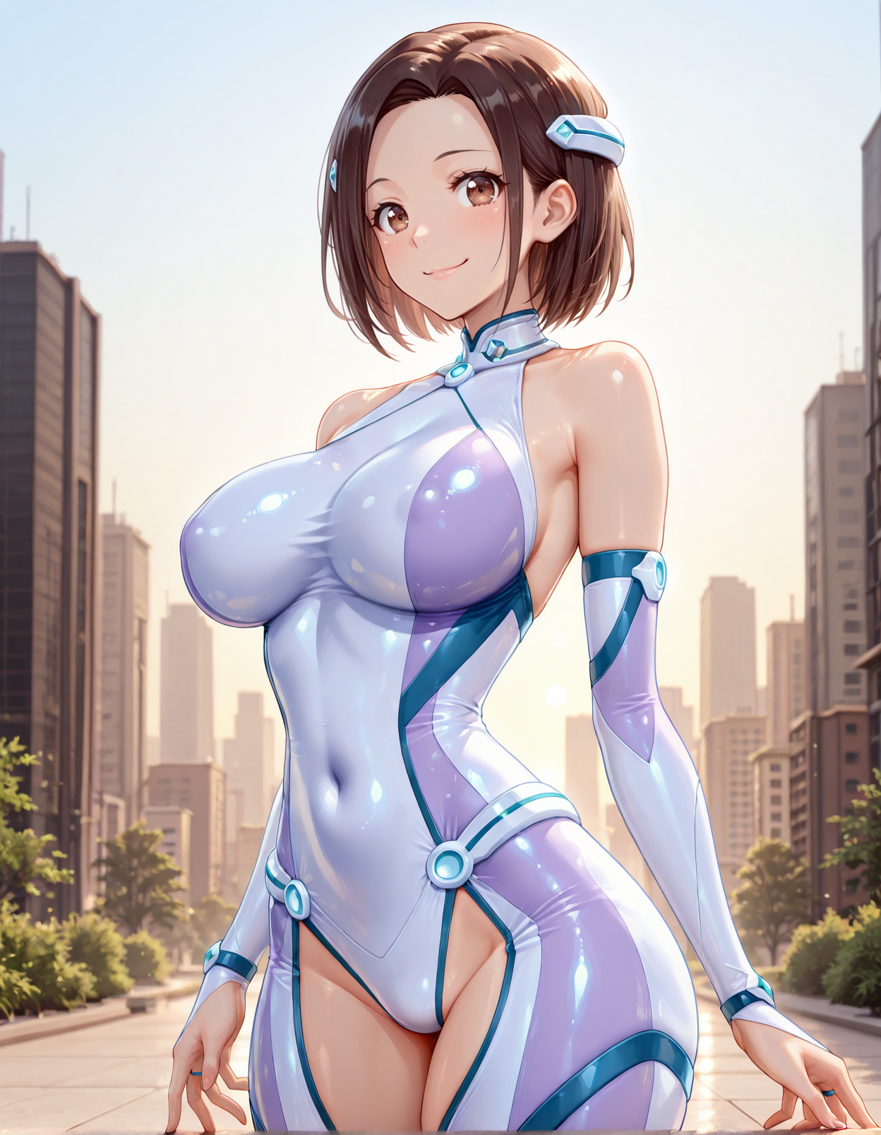 for her bodysuit: amino tokine, brown hair, brown eyes, short hair, elbow gloves, covered navel, hair ornament, gloves, bridal gauntlets, bare shoulders, multicolored bodysuit, white bodysuit, light purple bodysuit, clothing cutout, thigh cutout
