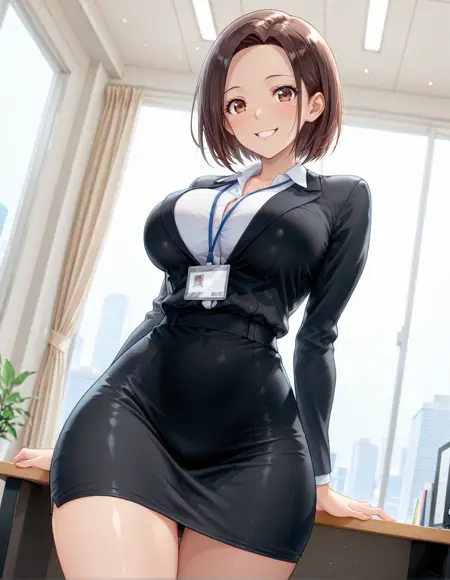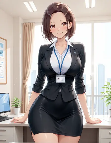 for her office suit: amino tokine, brown hair, brown eyes, short hair, office lady, pencil skirt