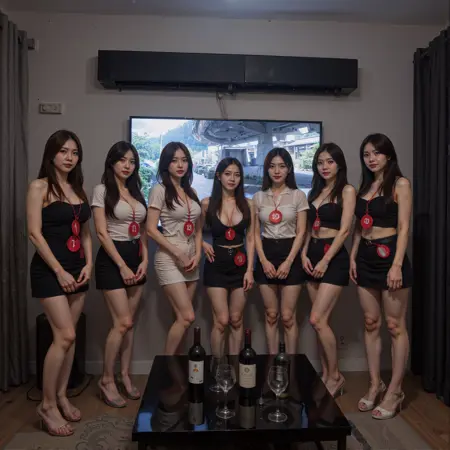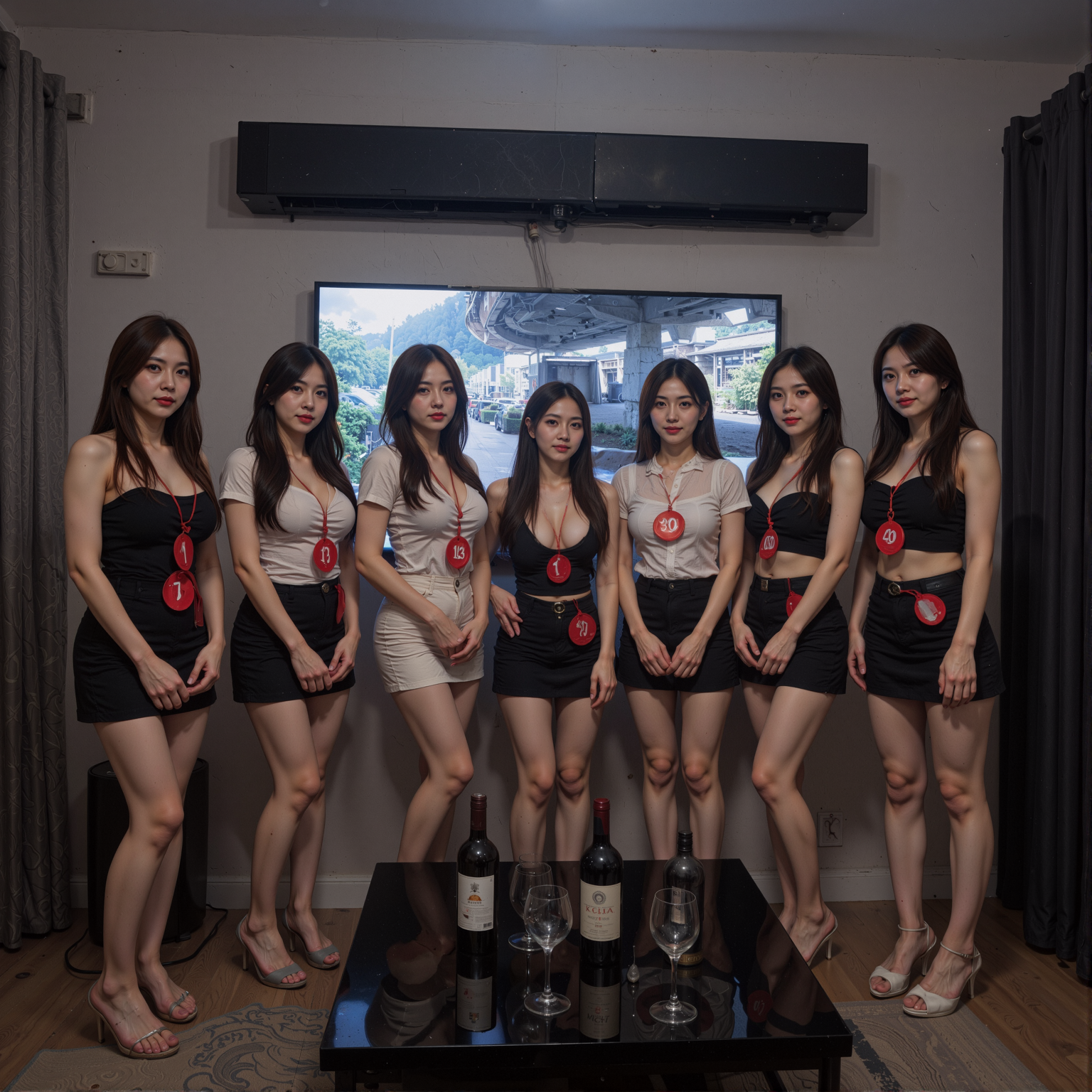 {3|4|a group of|4+} women standing in a tight line within a KTV room,