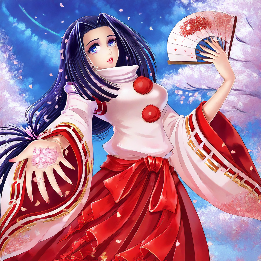 Bizuki_Mizuki, japanese clothes, blue eyes, long hair, cherry blossoms, wide sleeves, skirt, pom pom (clothes), black hair, low-tied, long hair, hakama, ribbon-trimmed sleeves, hakama skirt