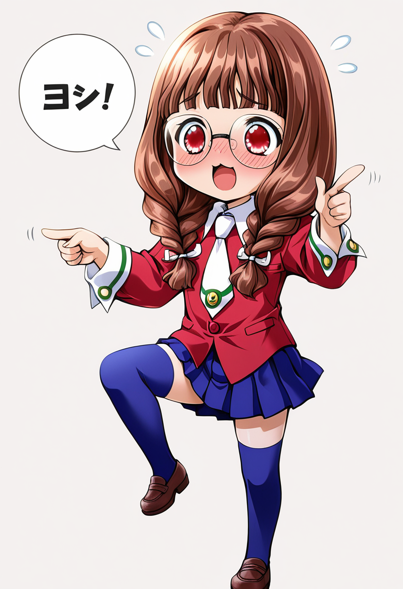 옷: 빨간 학교 유니폼, 흰색 칼라, 흰색 넥타이, 주름 스커트, 파란 스커트, 풀어진, 파란 허벅지 스타킹