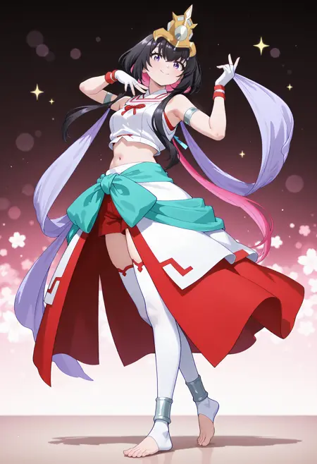 #2: gold head ornament, purple shawl, white sleeveless top, cropped top, red trim, silver armlets, white fingerless gloves, red wristbands, showgirl skirt, two-tone skirt, red skirt, white skirt, aqua sash, red shorts, white thighhighs, silver anklets, toeless socks, barefoot