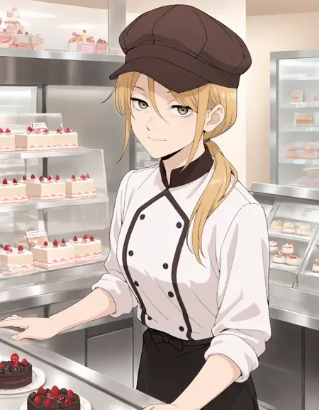 茶色の頭部装具、黒いシェフ用ユニフォーム、ダブルブレスト、袖をまくった状態、黒いエプロン、腰エプロン、長ズボン、靴下、黒い靴