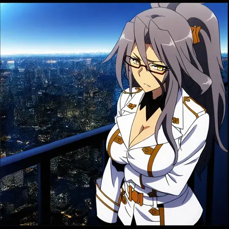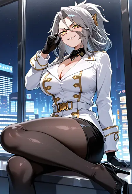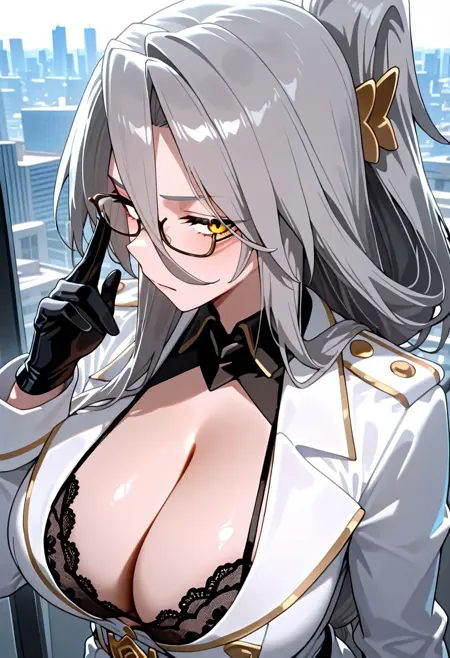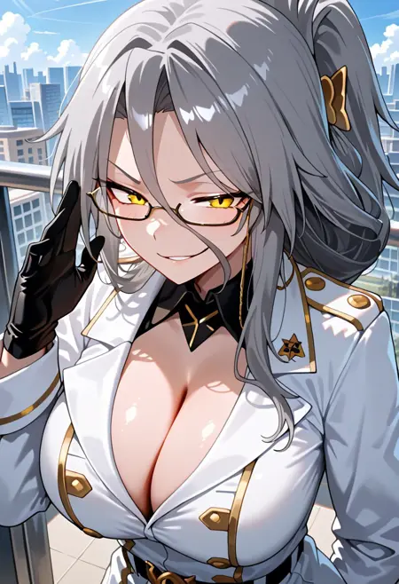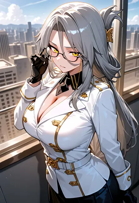 celenike、1人、女性、ストラップ付きメガネ、灰色の髪、ロングポニーテール、黄色い瞳