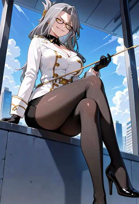 首飾り、白いユニフォーム、ベルト、手袋、スカート、黒いストッキング、ハイヒール靴