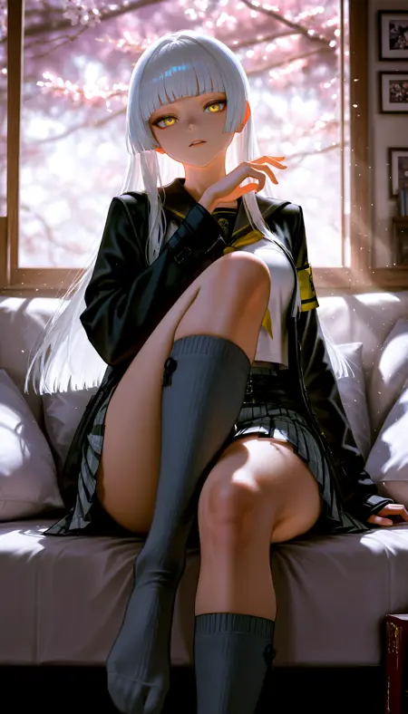ER_Rio, 1girl, yellow eyes, white hair, hime cut, long hair, blunt bangs, large breasts, wide hips, (thick thighs:1.1),