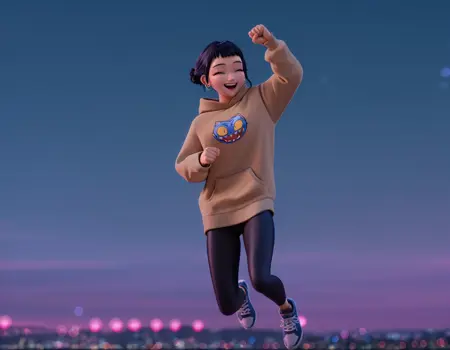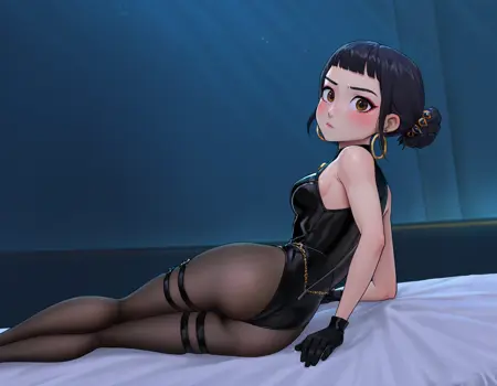 1girl, solo, zoey_kdh, 3d, black hair, brown eyes, short hair, hair bun, double hair bun, bangs, blunt bangs,