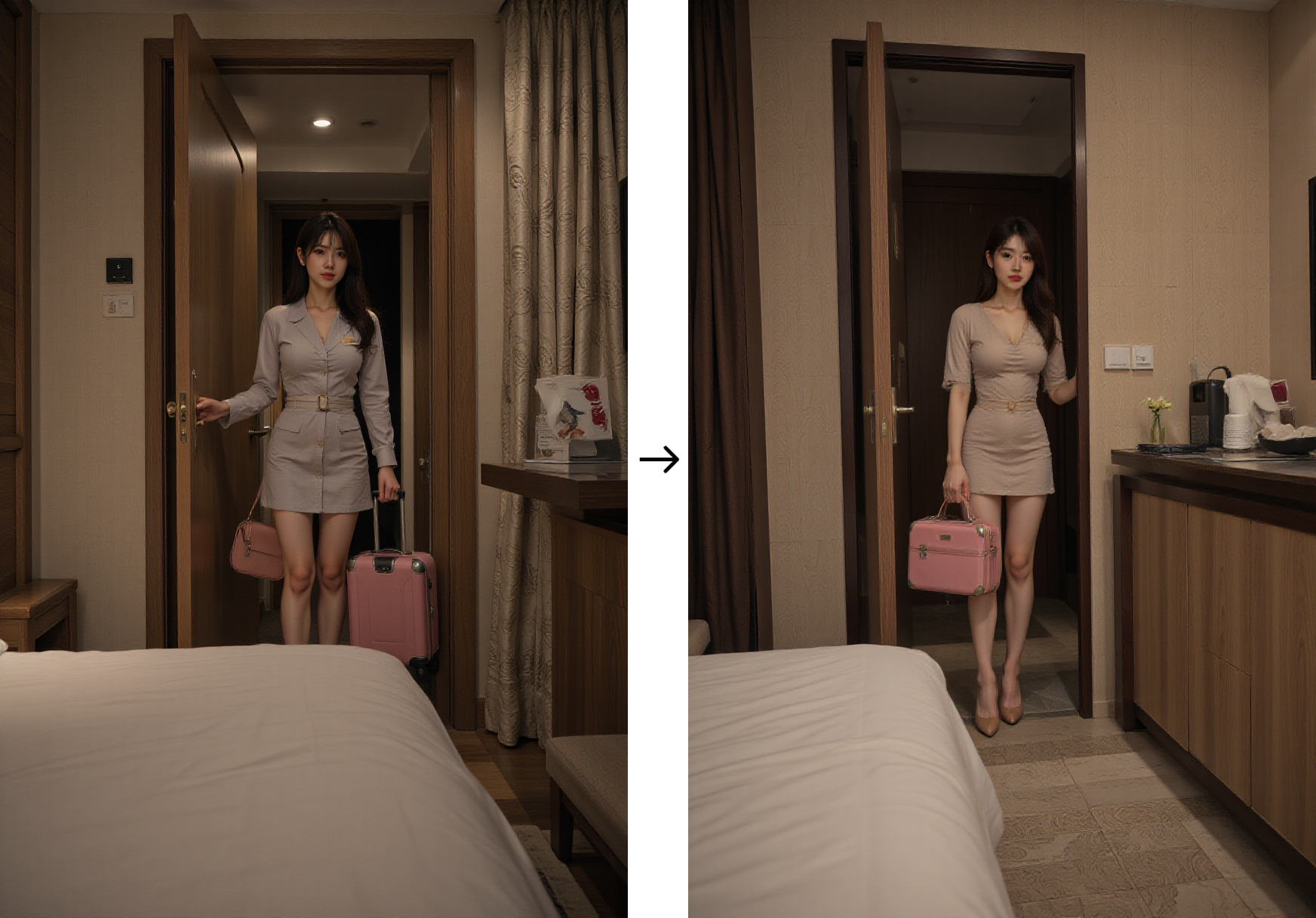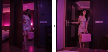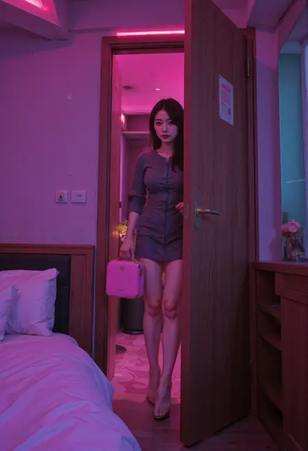 A hotel neon lits room scene with a half-open door, revealing a girl.