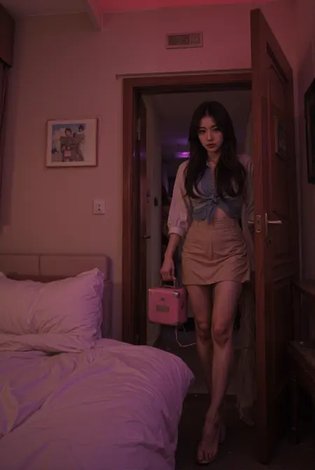A hotel neon lits room scene with a half-open door, revealing a girl.
