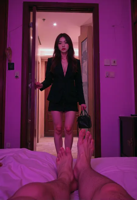 A hotel neon lits room scene with a half-open door, revealing a girl.