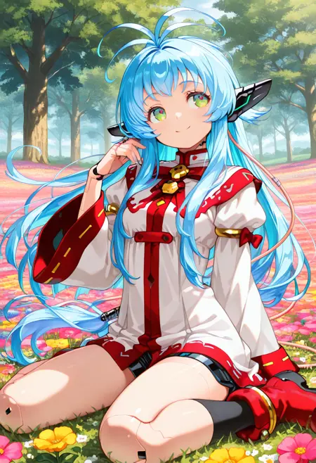 Trigger : althea, android, blue hair, long hair, antenna hair, robot ears, green eyes, cable from head, robot joints, white dress, wide sleeves, red ribbons, yellow brooches, black short pants, black socks, red boots,