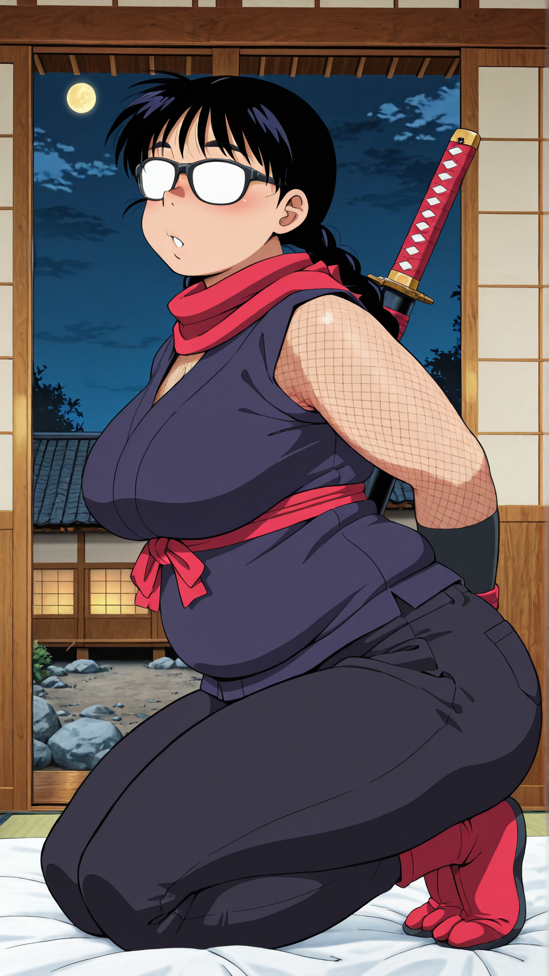 1girl, tatsum1, black hair, twin braids, plump, opaque glasses,