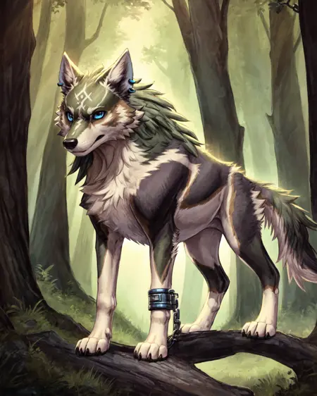Positives: wolflink, wolf, earrings, facial markings, single shackle, blue eyes