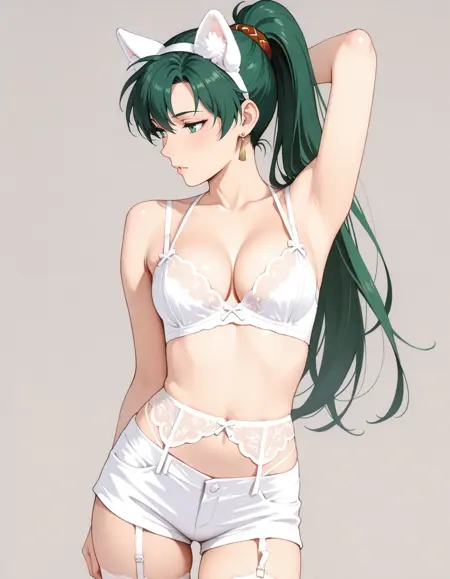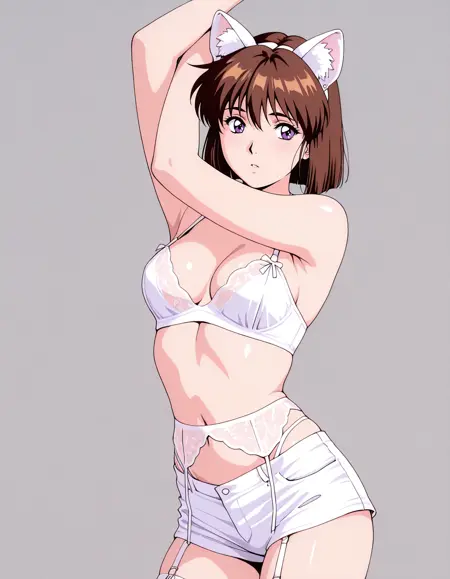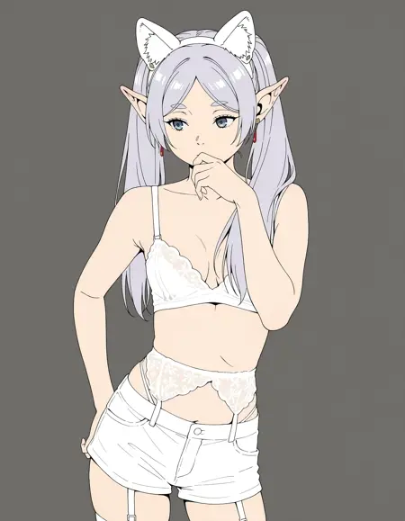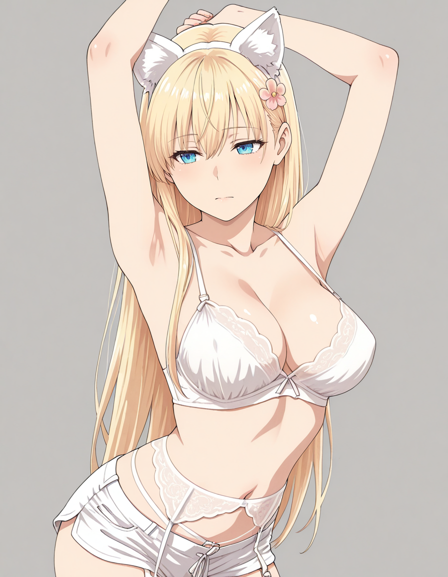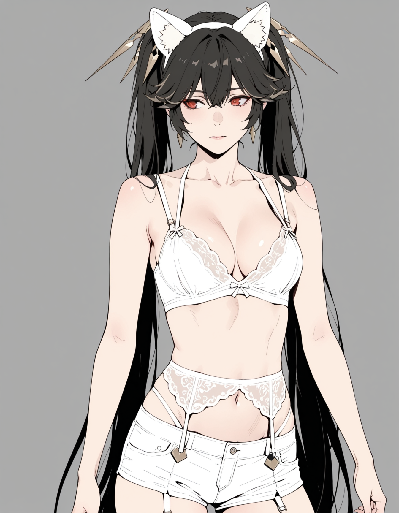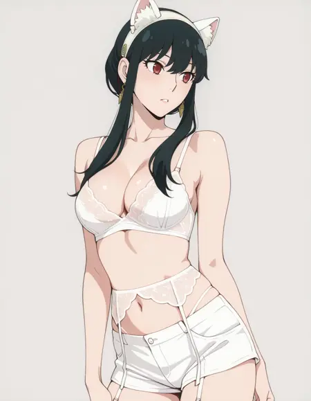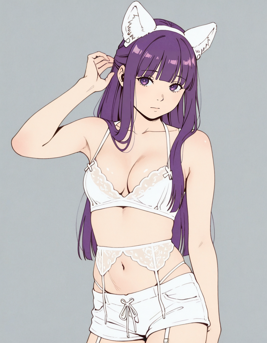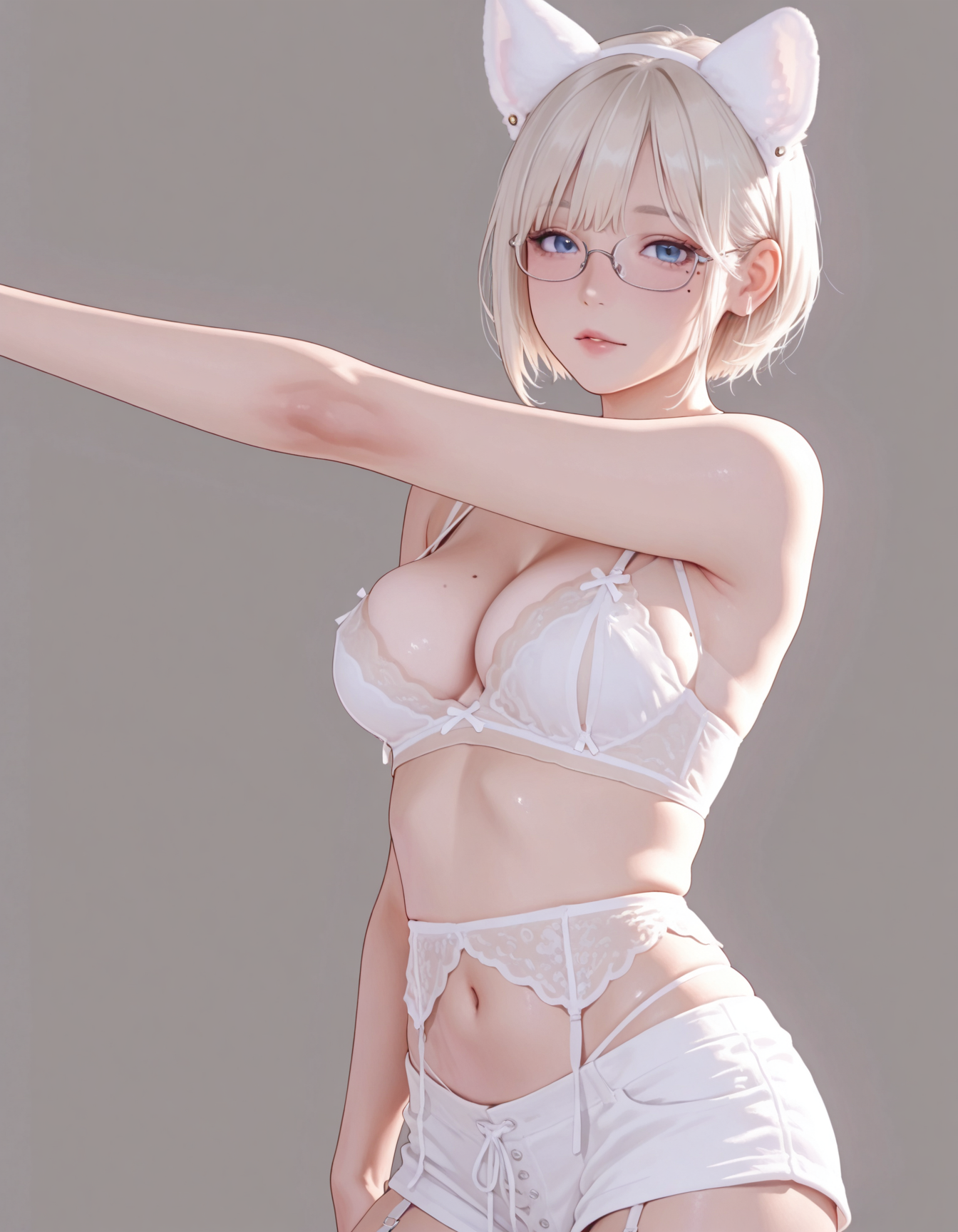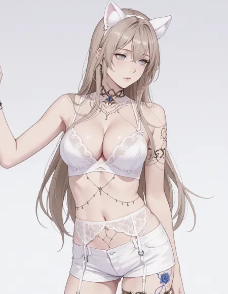 mai_bj_clothing_sexy_cat_5,fake_animal_ears,lingerie,white_bra,garter_belt,white short shorts