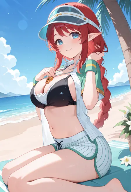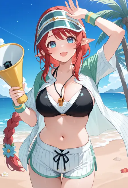 - pmisatsum, 땋은 꼬리, 모자, 녹색 셔츠, 흰 셔츠, 수직 줄무늬, 이색 셔츠, 열린 셔츠, 꽃, 목에 걸린 휘슬, 검은 비키니, 이색 비키니, 가슴 노출, 복부 노출, 팔찌, 돌핀 반바지, 흰 반바지, 줄무늬 반바지, 짧은 반바지,