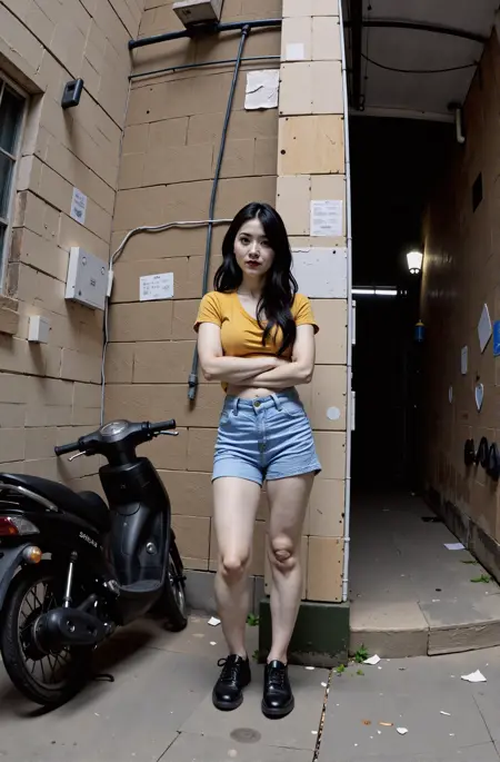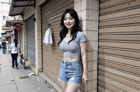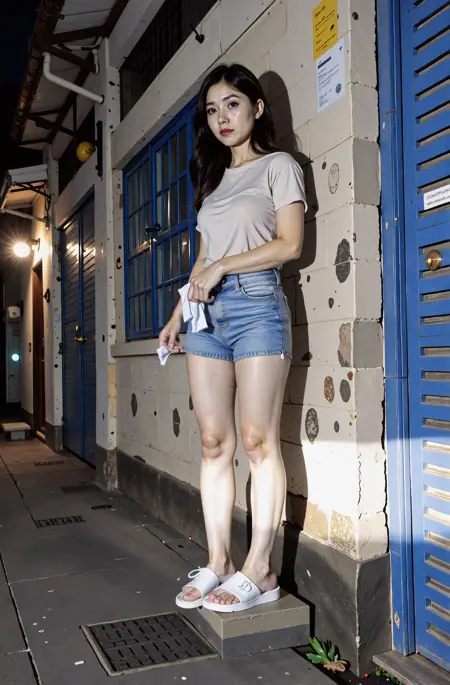 V1.1 版本的这个 LORA 模型擅长生成城中村背景下女孩靠墙的偷拍式单侧拍摄场景。对于更广的双侧街景或正面镜头,Beta 版本仍为最佳选择。