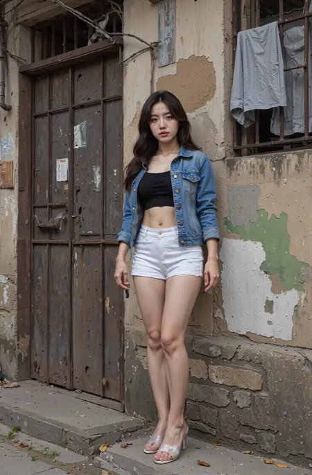 dirty, messy and dilapidated building exterior, visibly old or damaged wall, cluttered background, cc_girl,prostitution, street hooker, streetwalker