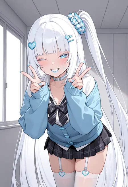 - ギャル, 片側を上げた髪, ヘアボウ, ヘアスクシュイ, ハート型の髪飾り, ヘアクリップ, チョーカー, 青いカーディガン, 袖が手首より長い, 白いシャツ, 黒い蝶ネクタイ, 横縞の蝶ネクタイ, 黒いスカート, プラッドスカート, ガーターストラップ, 白いスートハイ, ネイルポリッシュ,