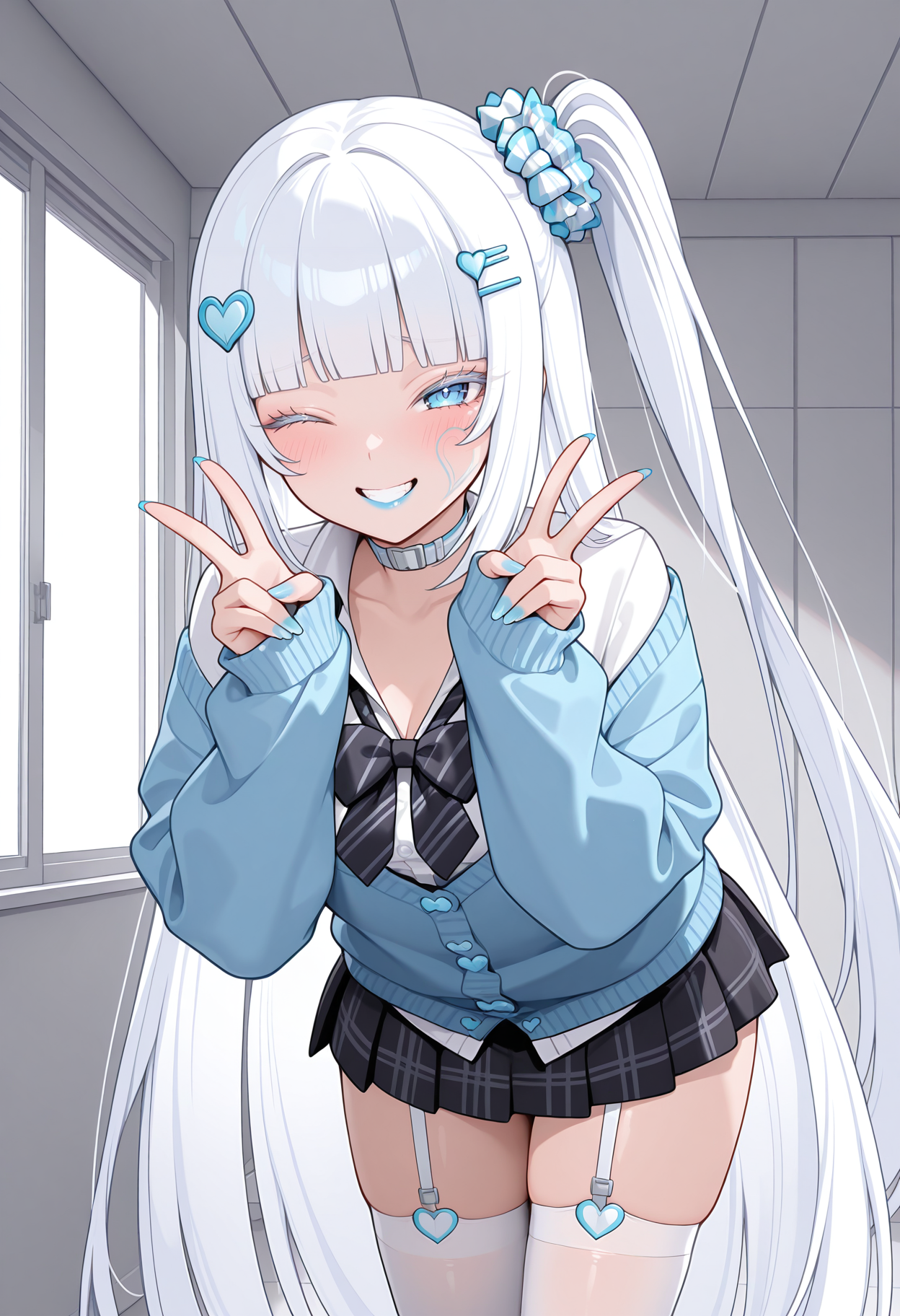 - 辣妹,单侧高束,发带,发圈,心形发饰,发夹,项圈,蓝色针织开衫,袖子长过手腕,白色衬衫,黑色蝴蝶结领带,条纹蝴蝶结领带,黑色短裙,格子短裙,吊袜带,白色过膝袜,指甲油,