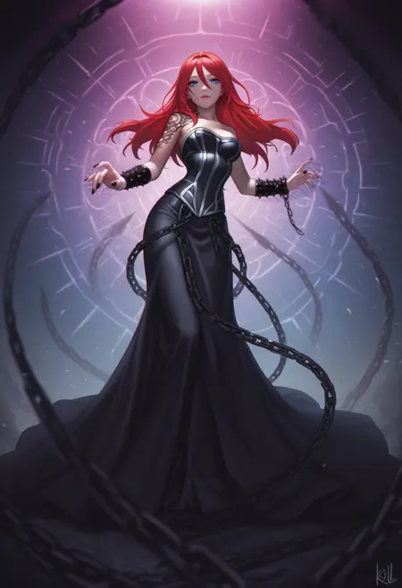 5killsona, blue eyes, red hair, hair between eyes, long hair, makeup, black dress, corset, black nails, tattoo, spiked bracelet,