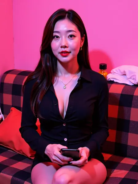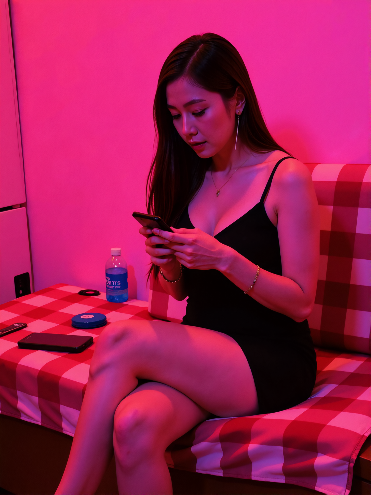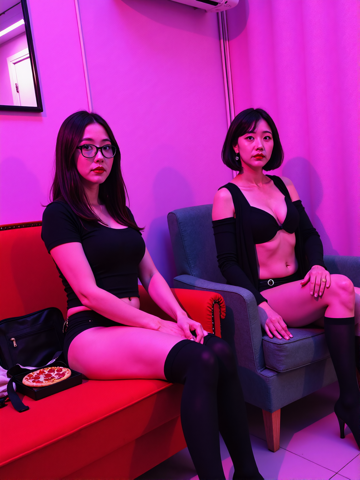 girls in neon ghetto room,girls in empty cheap neon room,enclosed room,neon_ghetto_room,sitting on a cheap sofa, girls, dim neon lit,dim lighting,dim lit,