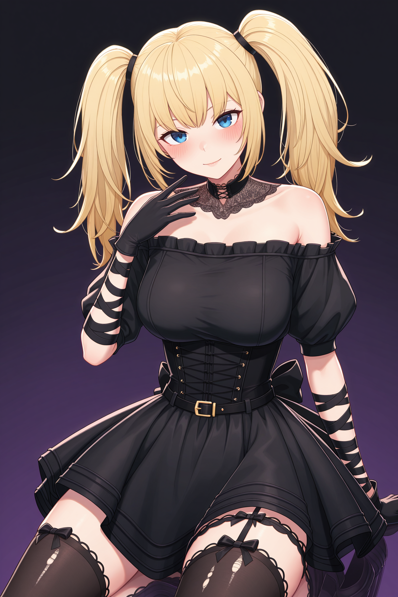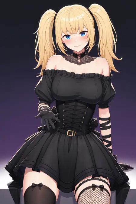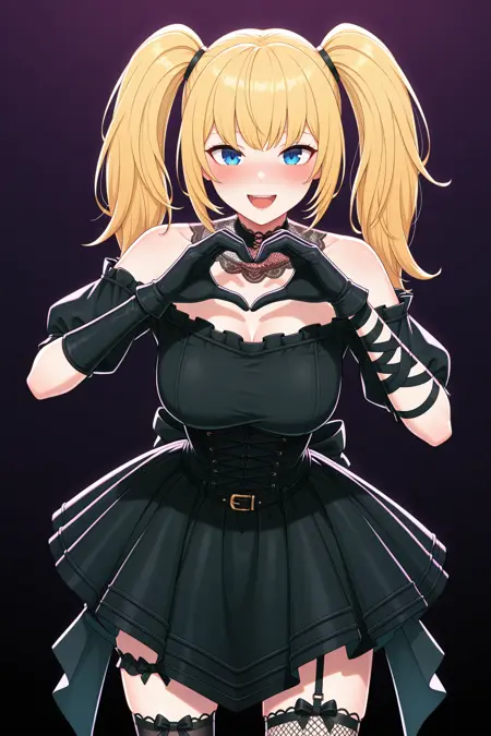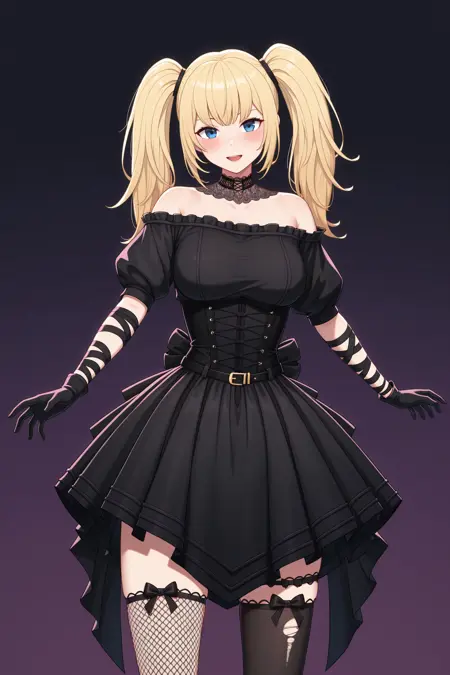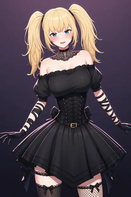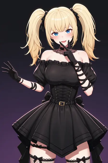 | 训练词汇 | Ani_(Grok), blonde hair, twintails, long hair, blue eyes,已复制! lace choker spreading over collarbones, off-shoulder black short dress, gothic, corset, belt, back bow, elbow‑length black gloves, ribbon arm wraps, zettai ryouiki, torn clothes, asymmetrical thigh‑highs: left fishnet stocking with bow garter, right sheer black stocking with bow garter,已复制! |