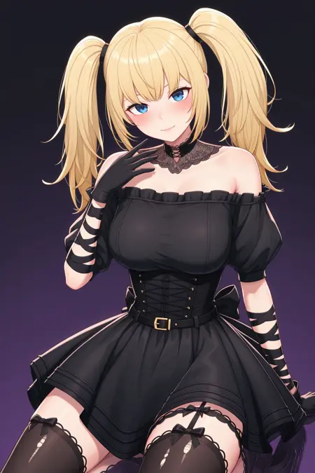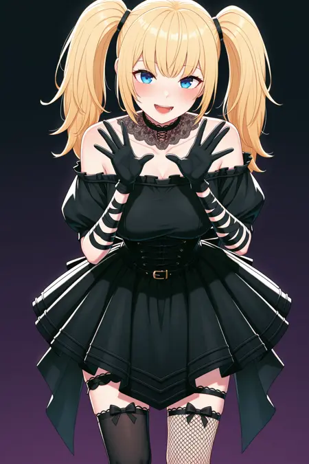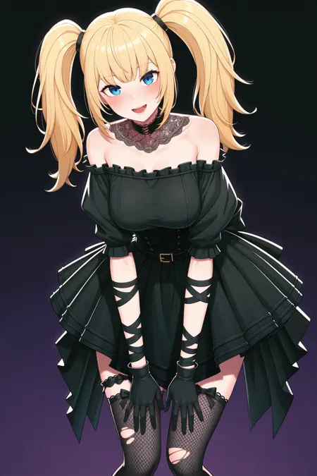 | Trained Words | Ani_(Grok), blonde hair, twintails, long hair, blue eyes,Copied! lace choker spreading over collarbones, off-shoulder black short dress, gothic, corset, belt, back bow, elbow‑length black gloves, ribbon arm wraps, zettai ryouiki, torn clothes, asymmetrical thigh‑highs: left fishnet stocking with bow garter, right sheer black stocking with bow garter,Copied! |