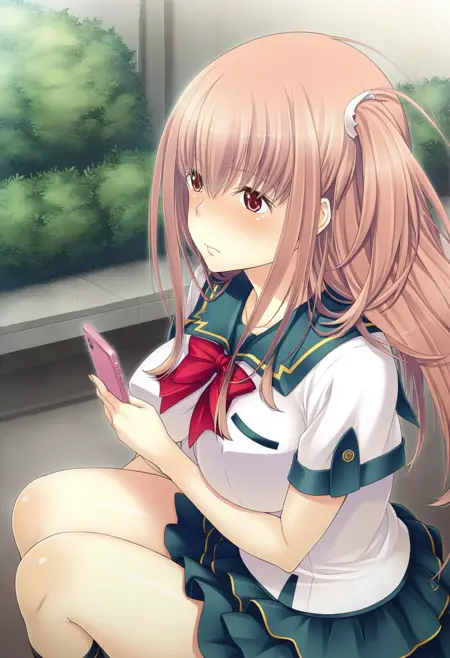 衣装: 学校制服, セーラー服, 緑色のセーラー襟, 赤いリボン, 短い袖, 緑色のスカート