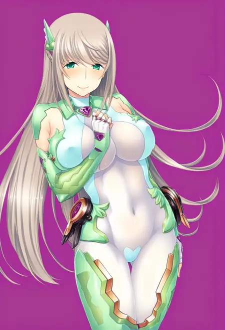 옷: 흰색 바디수트, 팔꿈치 장갑, 갑옷, 보라색 브로치, 손가락 없는 장갑, 녹색 허벅지 부츠,