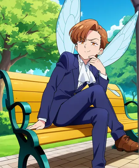 kingv2, male focus, solo, brown hair, orange eyes, wings, fairy wings, butterfly wings, 1boy, brown eyes, outfitk1, long sleeves, shoes, pants, ascot, brown footwear, formal, suit, blue pants, white ascot