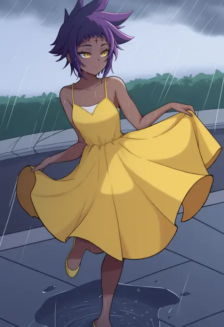 트리거 + 노아 외모: 검은 피부를 가진 여성, 이마의 문신, 짧은 머리, 보라색 머리, 날카로운 머리카락, 노란 눈