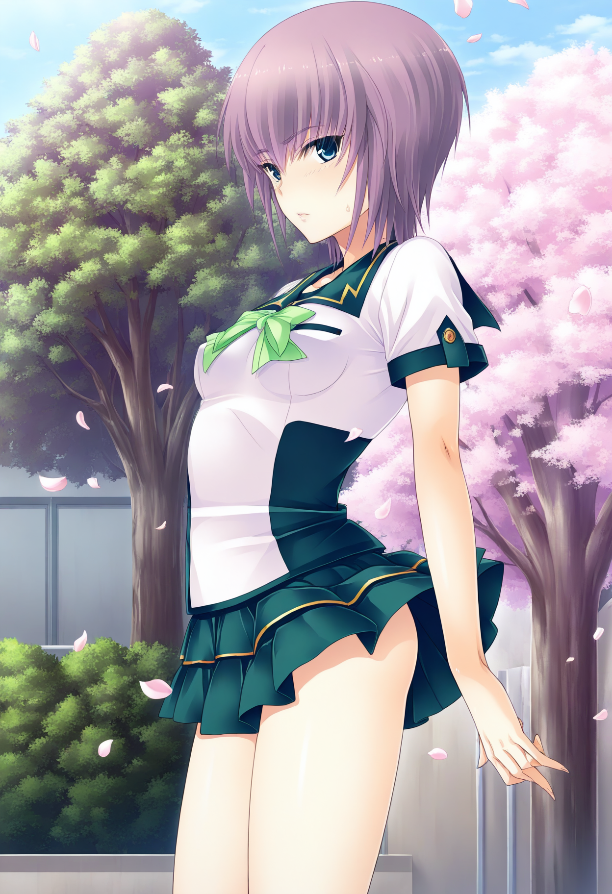 Clothing: school uniform, serafuku, green sailor collar, green bowtie, short sleeves, green skirt,
