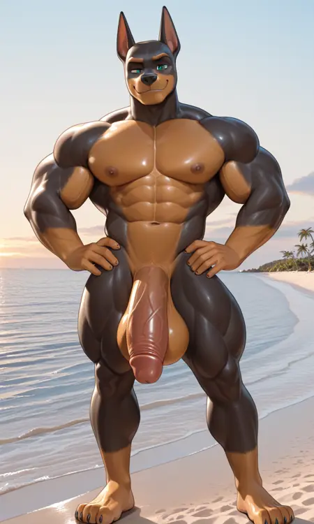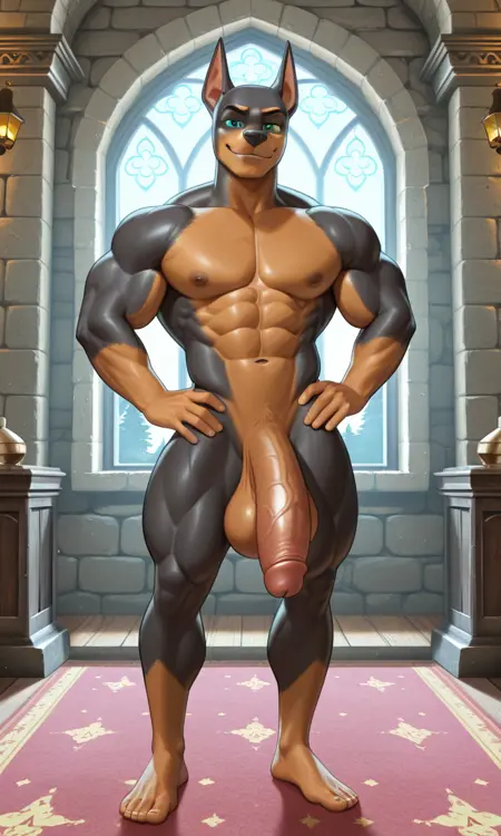 Claw (Paw Patrol), Male anthro Doberman Pinscher dog black and brown fur, teal eyes, black nose, long and narrow pointed ears, grey and black knight helmet with purple highlights, purple and grey suit of armor gray pup pack three-spiked armor around hands