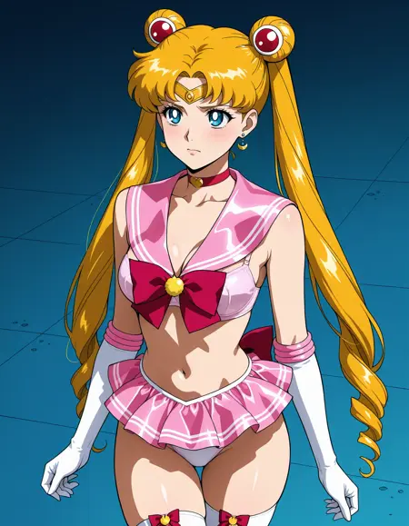 satin shiny clothes, elbow gloves, white panties, pink bra, pink skirt, pink sailor collar, sailor senshi uniform, bare shoulders, bow thighhighs, thigh gap, yellow gem, chest bow, bow thighighs, white knee_boots を使用して呼び出してください
