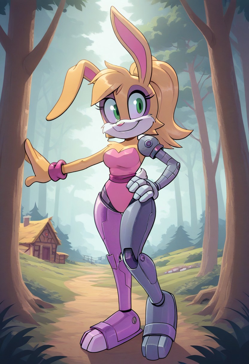 Bunnie Rabbot, light brown fur, white muzzle, green eyes, pink rabbit nose, light brown ponytail, pink leotard, metal cyborg arm, robotic legs, metal legs
