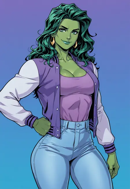 | 학습된 단어 | 1girl, solo, She-Hulk, Green hair, long hair, green eyes, green lips, colored skin, green-skinned female, gold earrings, purple jacket, letterman jacket, cleavage, purple shirt, white sleeves, blank jacket, tucked shirt, blue jeans, pink sneakers복사됨! |
