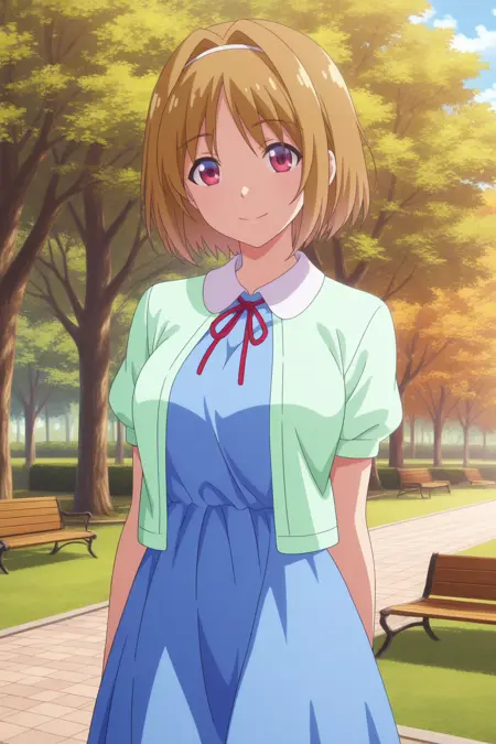 aakikyou, 빨간 눈, 갈색 머리카락, 머리카락 흐름, 흰색 헤어밴드, kikyouc1, 빨간색 목둘레 리본, 파란색 드레스, 녹색 카디건, 열린 카디건, 볼륨감 있는 짧은 소매, 애니메이션 컬러링,