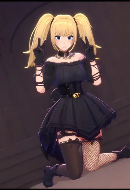 | 학습된 단어 | 1girl, AniGrok, bang, twintails,blonde hair, blue eyes,복사됨! black dress, black gloves, black thighhighs, black fishnet thighigh,fishnets,black choker,bare shoulders, off-shoulder dress, short sleeves,puffy sleeves,black bow, belt,black boots,복사됨! |