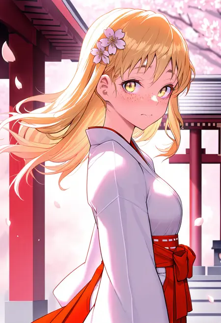 inabahonoka,blonde hair,yellow eyes,freckles,hair down,small breasts