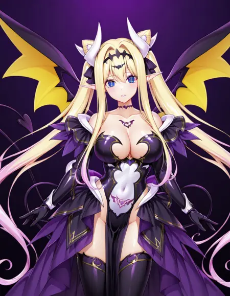 lora:ルクシエルLuxiel\_from\_光翼戦姫エクスティアKouyoku\_Senki\_ExS-Tia-000010:0.8 luxiel_exstia, white demon horns, demon wings, dress, horns, purple eyes, purple hair, pink hair, very long hair, hairband, hair intakes, pointy ears, hairband, cleavage tattoo, neck tattoo, slit pupils, demon tail, black thighhighs, thighhighs, pelvic curtain, gloves, gauntlets, tail, covered pubic tattoo, covered_navel