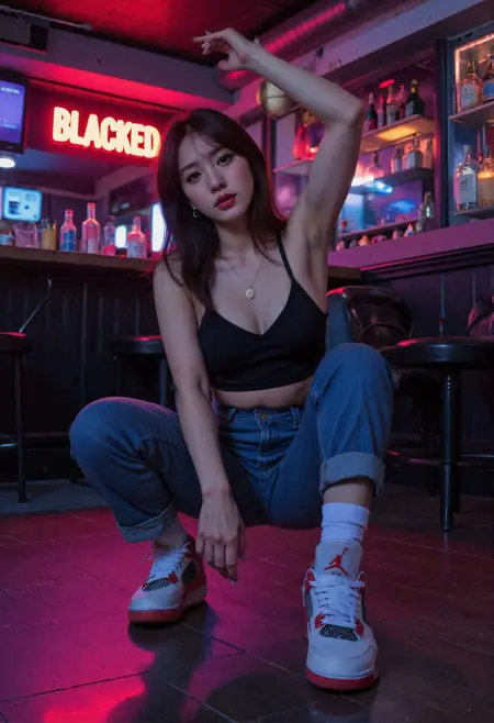 She is wearing sneakers, aj4, netting, visible air unit, jumpman logo, mid-top,