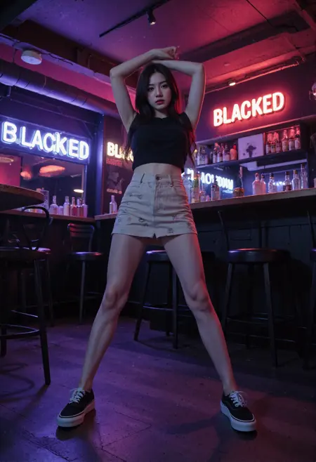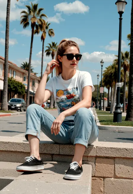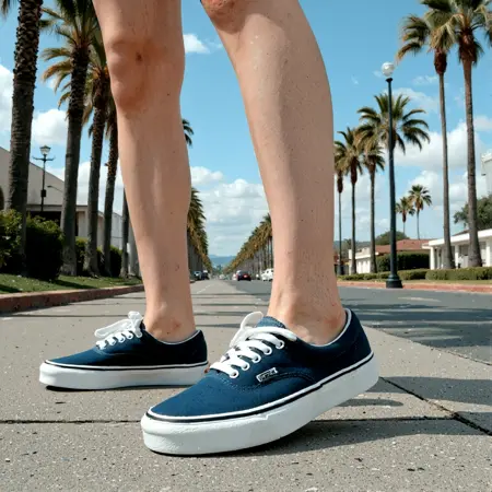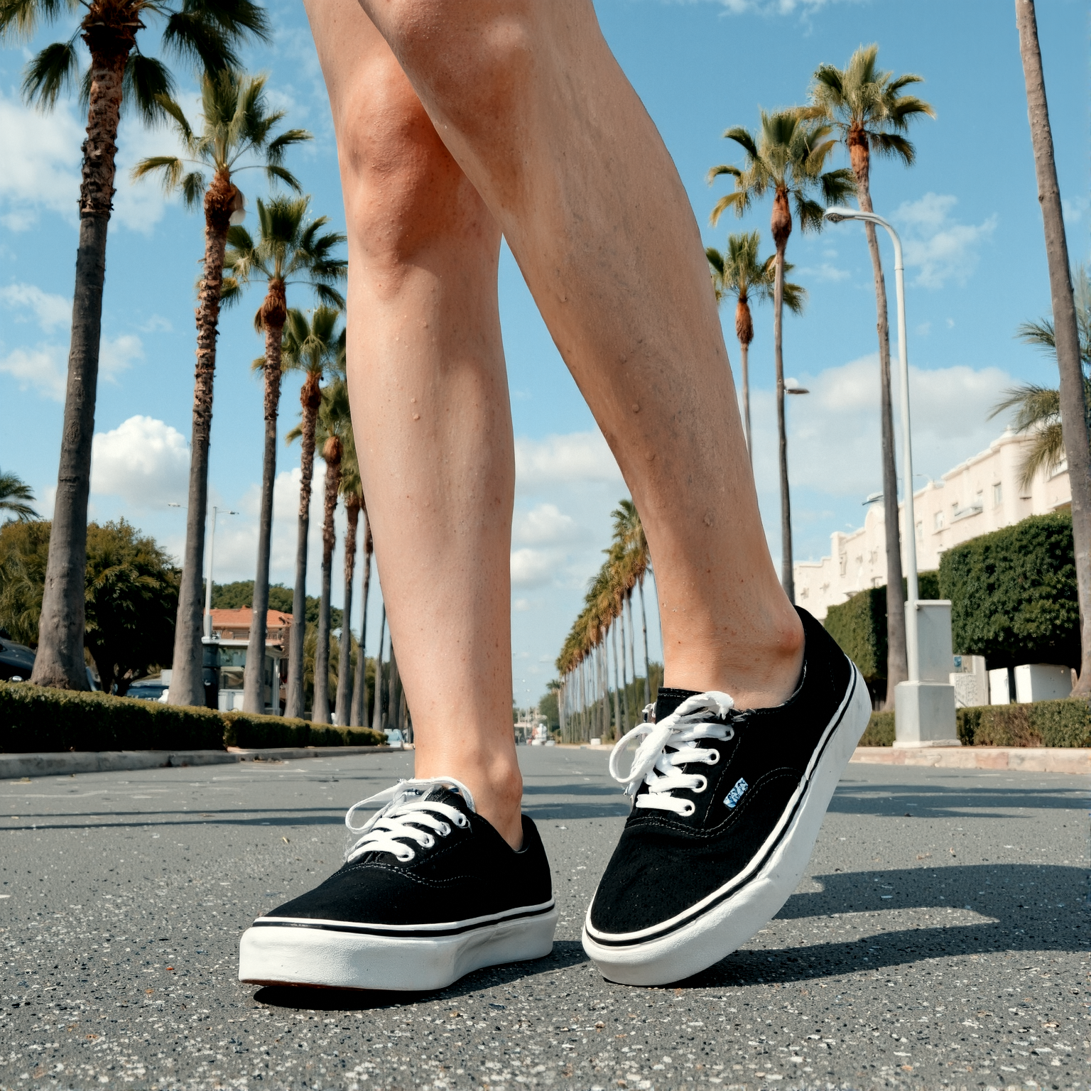 She is wearing black canvas shoes, sneaker, vans era, vans authentic,canvas upper, Vans sneakers with a white sole, sneakers,