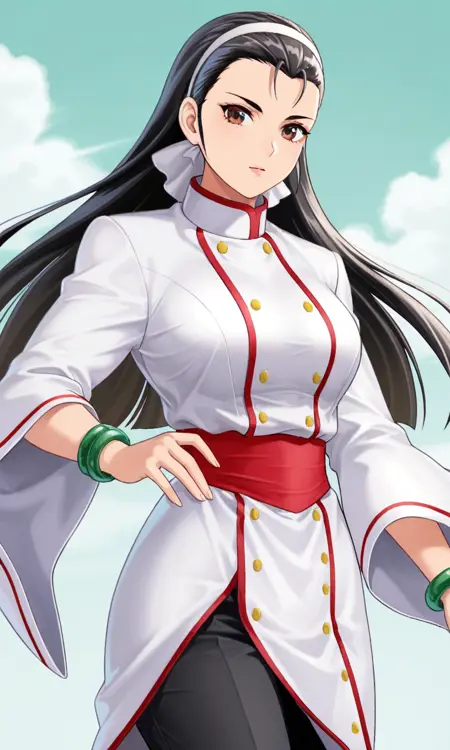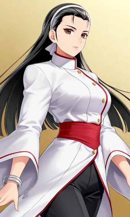 Chizuru Kagura,1girl,solo,black hair, long hair, hair slicked back, brown eyes, large breasts, bracelet, white headband,white jacket, wide sleeves, buttons, black pants, red sash,