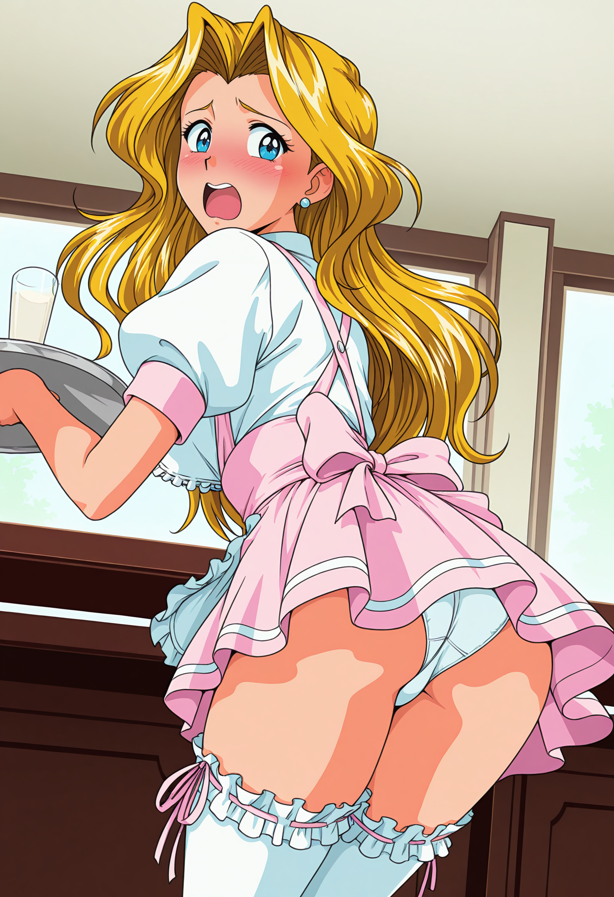• 服务员,白色衬衫,蓬松袖子,中心荷叶边,高腰裙,粉色裙子,荷叶边过膝袜,