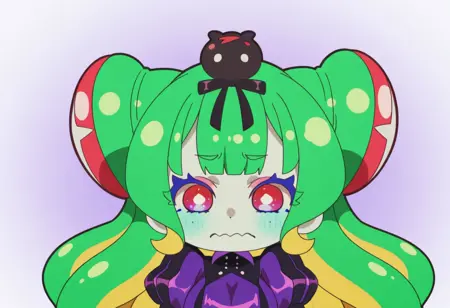 외모: 창백한 피부, 녹색 머리, 노랑 머리, 다색 머리, 촉수 머리, 더블번, :3