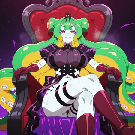 octo bow, green hair, blonde hair, multicolored hair, tentacle hair, double redbun,