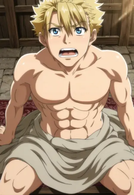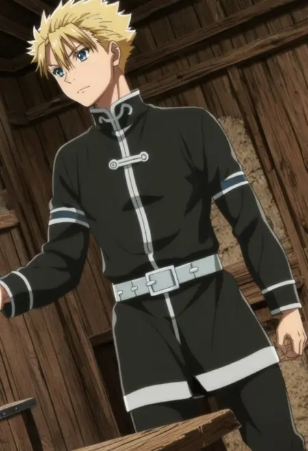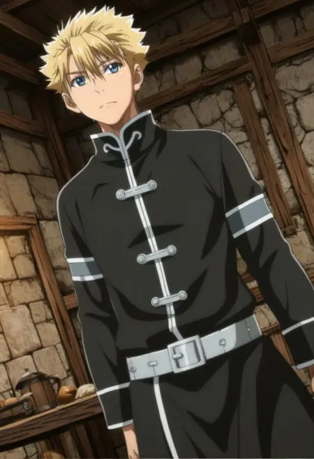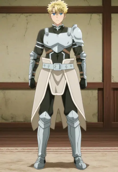 Peter Grill, blonde hair, blue eyes, black military tunic, silver and blue accents, silver armor, chestplate, single pauldron, vambraces, black gloves, silver belt, cloth faulds, black pants, armor boots