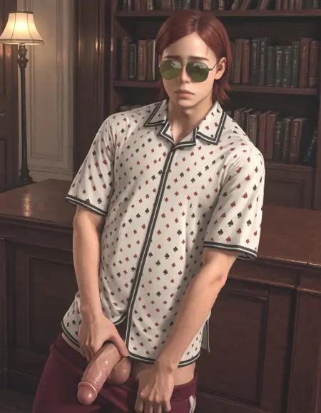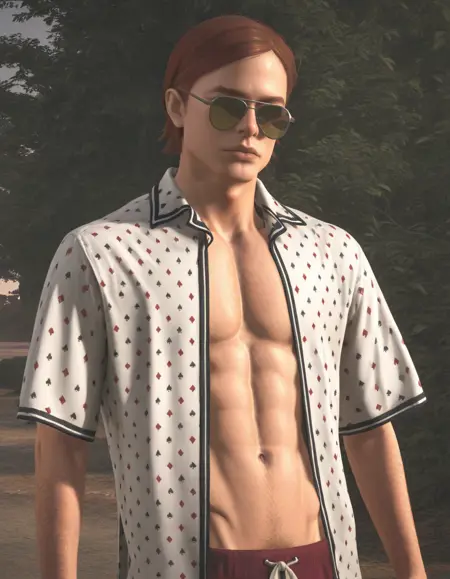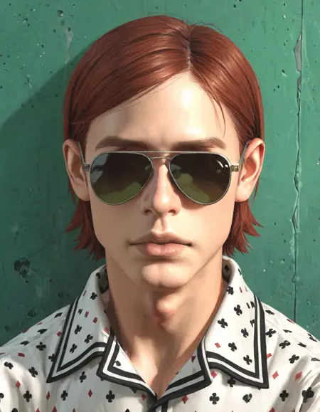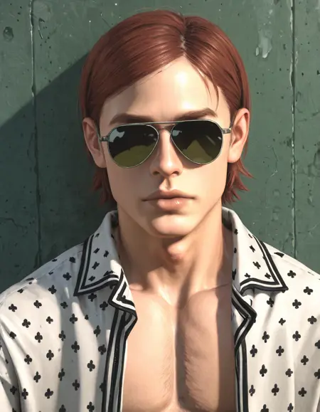 1boy, male focus, adult male, solo, collared white shirt, short sleeves, patterned shirt, auburn hair, parted hair, aviator sunglasses, hair behind ears, straight hair, button-up shirt, thick lips, skinny, realistic, looking at the viewer, (sunglasses hiding his eyes)